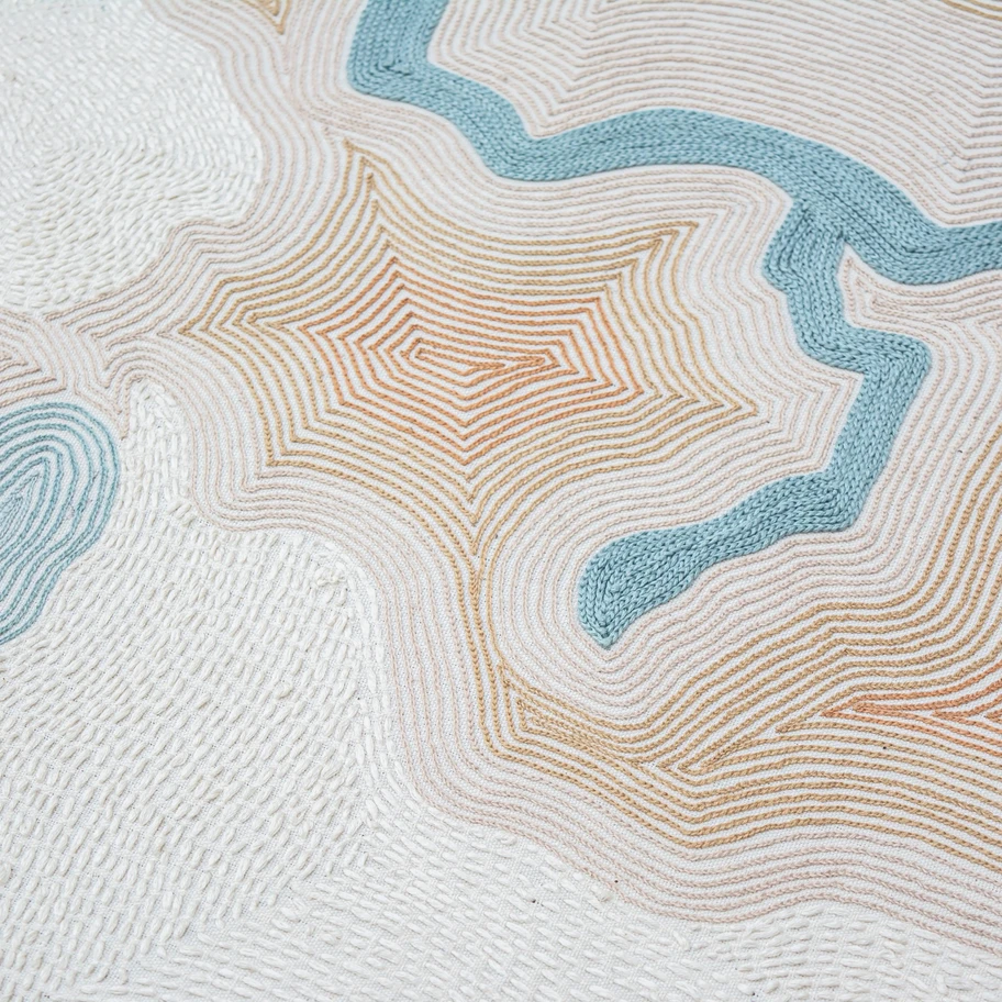 The textile abstractly represents the river’s journey, reimagining its map through art. It captures the Ganga’s rhythm, movement, and profound impact on the landscapes and communities it flows through.
